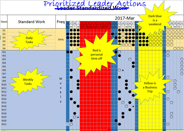 An Excel-based template to prepare monthly Leader Standardized Work (LSW) and a weekly personal planning sheet. Integrated with a robust and regular weekly planning routine, these templates can help a leader get and stay organized, accomplish more of their priorities, and improve action closure and follow-up, while not losing track of the most important personal priorities as well. Note, that there are macros within the templates to assist with date selection and printing only.