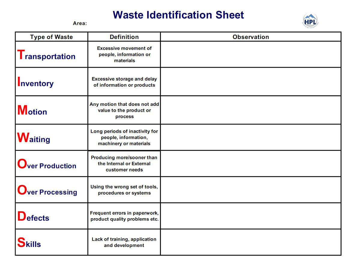 Identifying the 8 main forms of waste in the workplace is essential to drive a culture of continuous improvement, problem solving and engagement. TIM WOODS is an acronym representing the 8 forms of waste. Use this TIM WOODS waste form as a good tool for 'teaching your eyes' to see or for auditing the various forms of waste in your workplace.